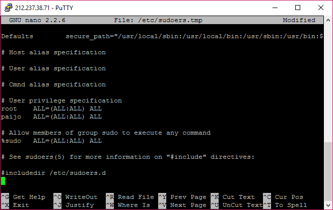 # User privilege specification root ALL=(ALL:ALL) ALL paijo ALL=(ALL:ALL) ALL