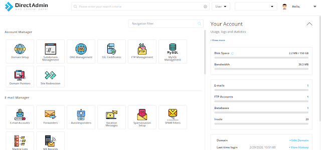 Dari segi tampilan, DirectAdmin terlihat cukup simpel dan modern, terutama jika menggunakan skin Icons Grid.